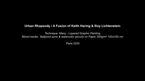 Urban Rhapsody / A Fusion of Keith Haring & Roy Lichtenstein Technique: Many - Layered Graphic Painting Mixed media: Ballpoint pens & watercolor pencils on Paper 300g/m² 100x150 cm Paris 2024