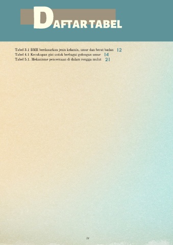 D AFTAR TABEL 12 Tabel 3.1 BMR berdasarkan jenis kelam in, umur dan berat bad an 14 Tabel 4.1 Kecukupan gizi untuk berbagai golongan umur 21 Tabel 5.1. Mekanisme pencernaan di dalam rongga mulut iv