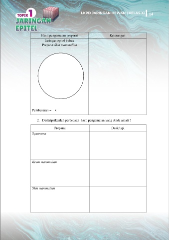 14 Hasil pengamatan preparat Keterangan Jaringan epitel kubus Preparat Skin mammalian Pembesaran = x 2. Deskripsikanlah perbedaan hasil pengamatan yang Anda amati ! Preparat Deskrispi Squamosa Ileum mammalian Skin mammalian