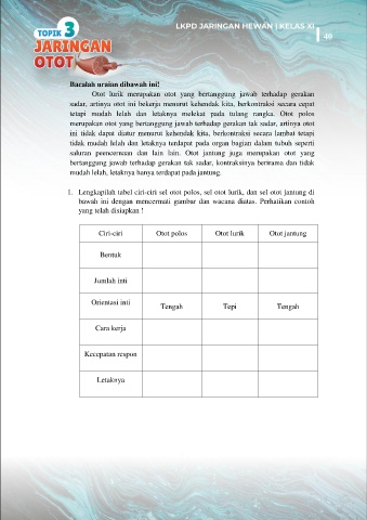 1. Lengkapilah tabel ciri-ciri sel otot polos, sel otot lurik, dan sel otot jantung di
