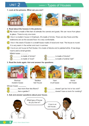 B I live in a modern house in Khartoum. It’s made of bricks. There are two floors and the