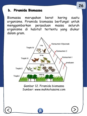 26 Biomassa merupakan berat kering suatu organisme. Piramida biomassa berfungsi untuk menggambarkan perpaduan massa seluruh organisme di habitat tertentu yang diukur dalam gram. Gambar 12. Piramida biomassa Sumber: www.mahkotasains.com