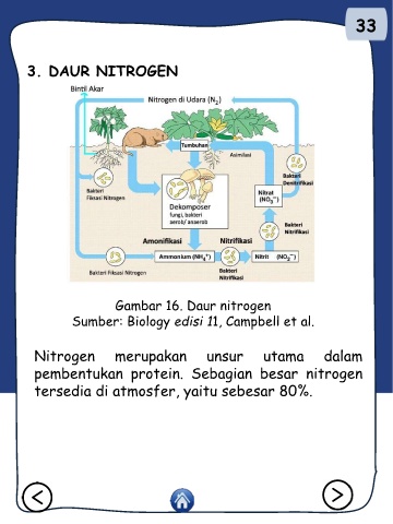 33 3. DAUR NITROGEN Gambar 16. Daur nitrogen Sumber: Biology edisi 11, Campbell et al. Nitrogen merupakan unsur utama dalam pembentukan protein. Sebagian besar nitrogen tersedia di atmosfer, yaitu sebesar 80%.