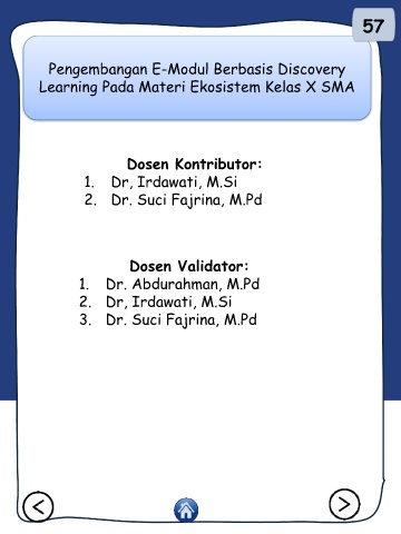 57 Pengembangan E-Modul Berbasis Discovery Learning Pada Materi Ekosistem Kelas X SMA Dosen Kontributor: 1. Dr, Irdawati, M.Si 2. Dr. Suci Fajrina, M.Pd Dosen Validator: 1. Dr. Abdurahman, M.Pd 2. Dr, Irdawati, M.Si 3. Dr. Suci Fajrina, M.Pd