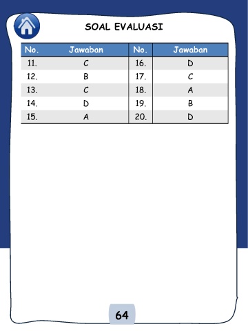 SOAL EVALUASI No. Jawaban No. Jawaban 11. C 16. D 12. B 17. C 13. C 18. A 14. D 19. B 15. A 20. D 64