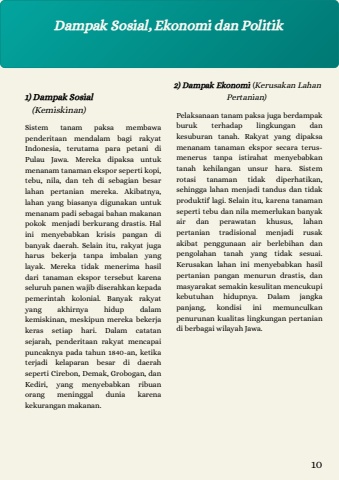 IngoudeDCompany Employee Handbook ampak Sosial, Ekonomi dan Politik1) Dampak Sosial(Kemiskinan)Sistem tanam paksa membawapenderitaan mendalam bagi rakyatIndonesia, terutama para petani diPulau Jawa. Mereka dipaksa untukmenanam tanaman ekspor seperti kopi,tebu, nila, dan teh di sebagian besarlahan pertanian mereka. Akibatnya,lahan yang biasanya digunakan untukmenanam padi sebagai bahan makananpokok menjadi berkurang drastis. Halini menyebabkan krisis pangan dibanyak daerah. Selain itu, rakyat jugaharus bekerja tanpa imbalan yanglayak. Mereka tidak menerima hasildari tanaman ekspor tersebut karenaseluruh panen wajib diserahkan kepadapemerintah kolonial. Banyak rakyatyang akhirnya hidup dalamkemiskinan, meskipun mereka bekerjakeras setiap hari. Dalam catatansejarah, penderitaan rakyat mencapaipuncaknya pada tahun 1840-an, ketikaterjadi kelaparan besar di daerahseperti Cirebon, Demak, Grobogan, danKediri, yang menyebabkan ribuanorang meninggal dunia karenakekurangan makanan.2) Dampak Ekonomi (Kerusakan LahanPertanian)Pelaksanaan tanam paksa juga berdampakburuk terhadap lingkungan dankesuburan tanah. Rakyat yang dipaksamenanam tanaman ekspor secara terusmenerus tanpa istirahat menyebabkantanah kehilangan unsur hara. Sistemrotasi tanaman tidak diperhatikan,sehingga lahan menjadi tandus dan tidakproduktif lagi. Selain itu, karena tanamanseperti tebu dan nila memerlukan banyakair dan perawatan khusus, lahanpertanian tradisional menjadi rusakakibat penggunaan air berlebihan danpengolahan tanah yang tidak sesuai.Kerusakan lahan ini menyebabkan hasilpertanian pangan menurun drastis, danmasyarakat semakin kesulitan mencukupikebutuhan hidupnya. Dalam jangkapanjang, kondisi ini memunculkanpenurunan kualitas lingkungan pertaniandi berbagai wilayah Jawa.10