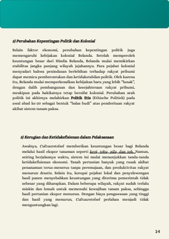 Ingoude Company Employee Handbook2) Perubahan Kepentingan Politik dan KolonialSelain faktor ekonomi, perubahan kepentingan politik jugamemengaruhi kebijakan kolonial Belanda. Setelah memperolehkeuntungan besar dari Hindia Belanda, Belanda mulai memikirkanstabilitas jangka panjang wilayah jajahannya. Para pejabat kolonialmenyadari bahwa penindasan berlebihan terhadap rakyat pribumidapat memicu pemberontakan dan ketidakstabilan politik. Oleh karenaitu, Belanda mulai memperkenalkan kebijakan baru yang lebih %u201clunak%u201d,dengan dalih pembangunan dan kesejahteraan rakyat pribumi,meskipun pada hakikatnya tetap bersifat kolonial. Perubahan arahpolitik ini akhirnya melahirkan Politik Etis (Ethische Politiek) padaawal abad ke-20 sebagai bentuk %u201cbalas budi%u201d atas penderitaan rakyatakibat sistem tanam paksa.3) Kerugian dan Ketidakefisienan dalam PelaksanaanAwalnya, Cultuurstelsel memberikan keuntungan besar bagi Belandamelalui hasil ekspor tanaman seperti kopi, tebu, nila, dan teh. Namun,seiring berjalannya waktu, sistem ini mulai menunjukkan tanda-tandaketidakefisienan ekonomi. Tanah pertanian banyak yang rusak akibatpenanaman terus-menerus tanpa peremajaan, dan produktivitas rakyatmenurun drastis. Selain itu, korupsi pejabat lokal dan penyelewenganhasil panen menyebabkan keuntungan yang diterima pemerintah tidaksebesar yang diharapkan. Dalam beberapa wilayah, rakyat sudah terlalumiskin dan lemah untuk memenuhi kewajiban tanam paksa, sehinggahasil pertanian ekspor menurun. Dengan biaya pengawasan yang tinggidan hasil yang menurun, Cultuurstelsel perlahan menjadi tidakmenguntungkan lagi.14