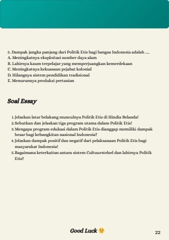 5. Dampak jangka panjang dari Politik Etis bagi bangsa Indonesia adalah %u2026.A. Meningkatnya eksploitasi sumber daya alamB. Lahirnya kaum terpelajar yang memperjuangkan kemerdekaanC. Meningkatnya kekuasaan pejabat kolonialD. Hilangnya sistem pendidikan tradisionalE. Menurunnya produksi pertanianSoal Essay1.Jelaskan latar belakang munculnya Politik Etis di Hindia Belanda!2.Sebutkan dan jelaskan tiga program utama dalam Politik Etis!3.Mengapa program edukasi dalam Politik Etis dianggap memiliki dampakbesar bagi kebangkitan nasional Indonesia?4.Jelaskan dampak positif dan negatif dari pelaksanaan Politik Etis bagimasyarakat Indonesia!5.Bagaimana keterkaitan antara sistem Cultuurstelsel dan lahirnya PolitikEtis?Good Luck %ud83d%ude09 22