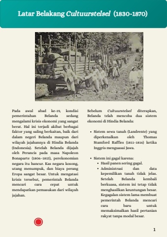 Latar Belakang Cultuurstelsel (1830-1870)Pada awal abad ke-19, kondisipemerintahan Belanda sedangmengalami krisis ekonomi yang sangatberat. Hal ini terjadi akibat berbagaifaktor yang saling berkaitan, baik daridalam negeri Belanda maupun dariwilayah jajahannya di Hindia Belanda(Indonesia). Setelah Belanda dijajaholeh Perancis pada masa NapoleonBonaparte (1806%u20131813), perekonomiannegara itu hancur. Kas negara kosong,utang menumpuk, dan biaya perangEropa sangat besar. Untuk mengatasikrisis tersebut, pemerintah Belandamencari cara cepat untukmendapatkan pemasukan dari wilayahjajahan.1Sebelum Cultuurstelsel diterapkan,Belanda telah mencoba dua sistemekonomi di Hindia Belanda:Sistem sewa tanah (Landrente) yangdiperkenalkan oleh ThomasStamford Raffles (1811%u20131816) ketikaInggris menguasai Jawa.Sistem ini gagal karena:Hasil panen sering gagal.Administrasi dan datakepemilikan tanah tidak jelas.Setelah Belanda kembaliberkuasa, sistem ini tetap tidakmenghasilkan keuntungan besar.Kegagalan sistem lama membuatpemerintah Belanda mencaricara baru untukmemaksimalkan hasil pertanianrakyat tanpa modal besar.