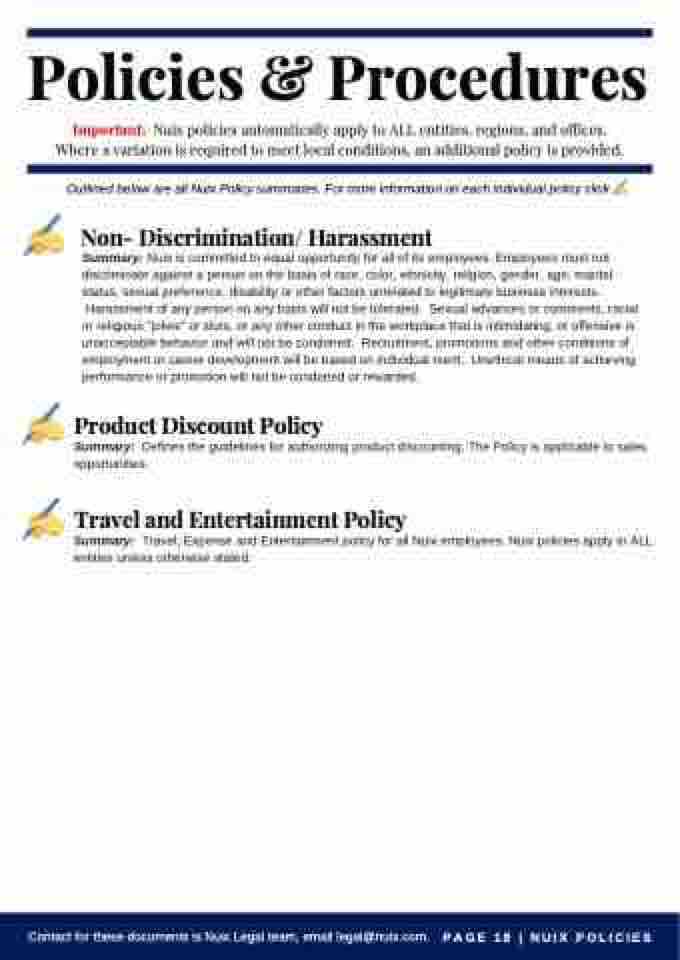 Important: Nuix policies automatically apply to ALL entities, regions, and offices. Where a variation is required to meet local conditions, an additional policy is provided.