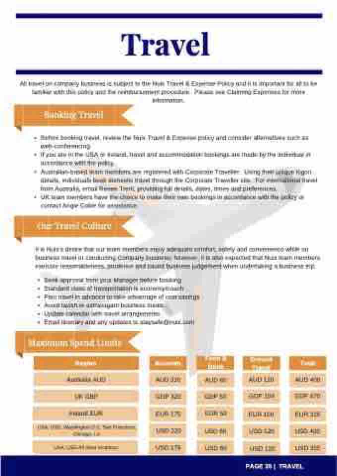It is Nuix's desire that our team members enjoy adequate comfort, safety and convenience while on business travel or conducting Company business; however, it is also expected that Nuix team members exercise reasonableness, prudence and sound business judgement when undertaking a business trip.