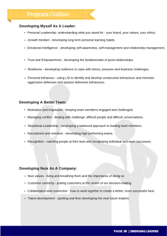 Motivation and Inspiration - keeping team members engaged and challenged. Managing conflict - dealing with challenge, difficult people and difficult conversations.