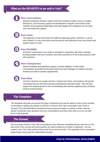 The templates will guide you around the types of questions you may be asked in each of your monthly conversations, helping you prepare so that the 15 minute Time Talk conversation each month is focused. If you find that different questions help you and your leader to achieve a better outcome, please incorporate those questions into your conversations and share them with us so we can add them to these guides.