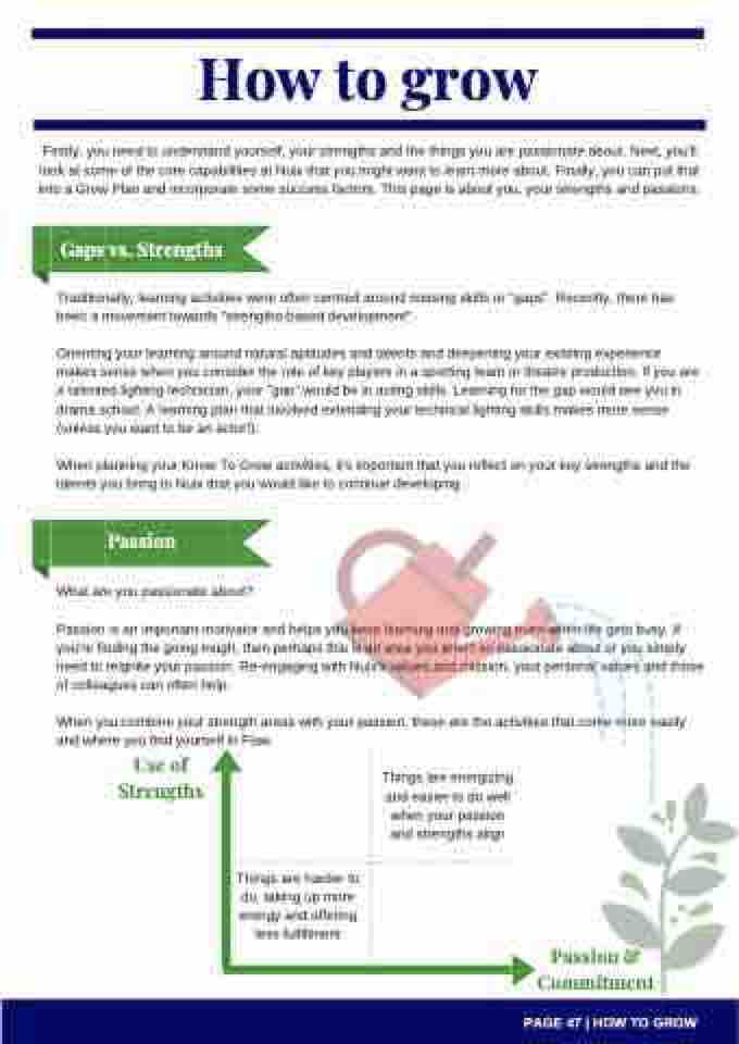 Firstly, you need to understand yourself, your strengths and the things you are passionate about. Next, you'll look at some of the core capabilities at Nuix that you might want to learn more about. Finally, you can put that into a Grow Plan and incorporate some success factors. This page is about you, your strengths and passions.