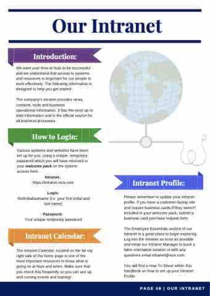 The Employee Essentials section of our Intranet is a great place to begin exploring. Log into the Intranet as soon as possible and email our Intranet Manager to book a tailor orientation session or with any questions email intranet@nuix.com.
