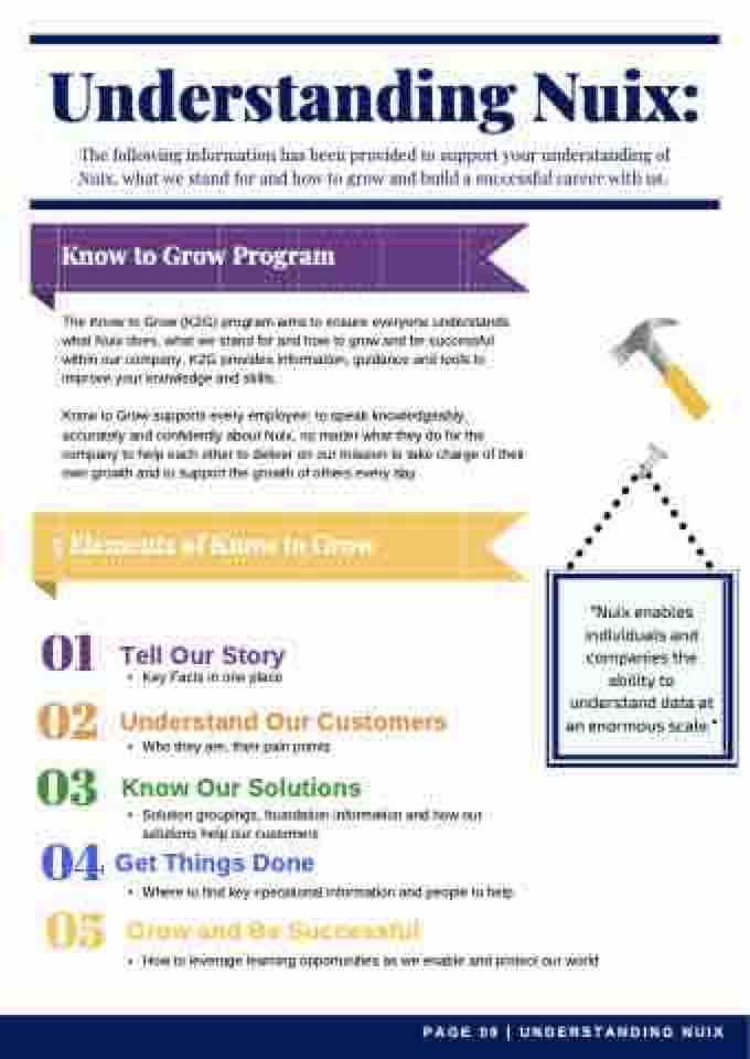The Know to Grow (K2G) program aims to ensure everyone understands what Nuix does, what we stand for and how to grow and be successful within our company. K2G provides information, guidance and tools to improve your knowledge and skills.