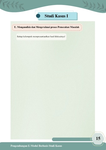 Studi Kasus I E. Menganalisis dan Mengevaluasi proses Pemecahan Masalah Setiap kelompok mempresentasikan hasil diskusinya! I 15 Pengembangan E-Modul Berbasis Studi Kasus