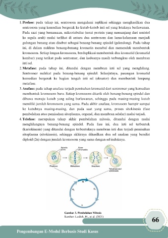 1.Profase: pada tahap ini, sentrosom mengalami replikasi sehingga menghasilkan dua