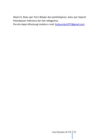 Abad 21, Buku ajar Teori Belajar dan pembelajaran, buku ajar Sejarah Kebudayaan Indonesia dan lain sebagainya. Penulis dapat dihubungi melalui e-mail: lizahusnita1977@gmail.com Liza Husnita, M. Pd 53