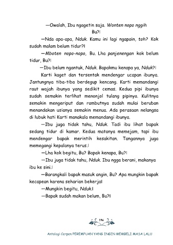 ―Ibu belum ngantuk, Nduk. Bapakmu kenapa ya, Nduk?‖