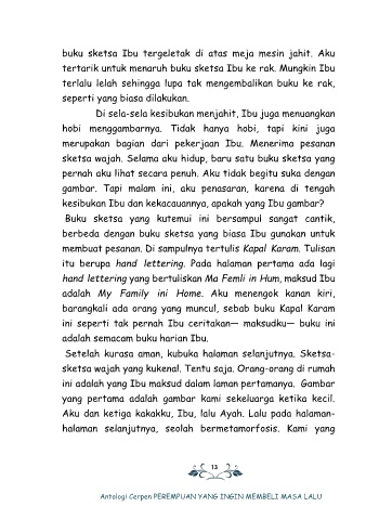buku sketsa Ibu tergeletak di atas meja mesin jahit. Aku