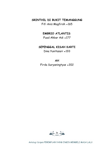 SRINTHIL DI BUKIT TEMANGGUNG Fifi Anis Magfiroh ▪165 EMBRIO ATLANTIS Fuad Akbar Adi ▪177 SEPENGGAL KISAH KARTI Dina Yunitasari ▪193 AH Firda Suryaningtyas ▪202 ix Antologi Cerpen PEREMPUAN YANG INGIN MEMBELI MASA LALU