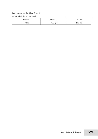 Satu resep menghasilkan 5 porsi Informasi nilai gizi per porsi: Energi Protein Lemak 168 kkal 15,6 gr 11,2 gr Menu Makanan Indonesia 221