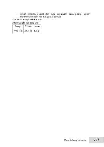 • Setelah matang, angkat dan buka bungkusan daun pisang. Sajikan Bilenthango dengan nasi hangat dan sambal. Satu resep menghasilkan 4 porsi Informasi nilai gizi per porsi: Energi Protein Lemak 104,8 kkal 22,75 gr 0,9 gr Menu Makanan Indonesia 227