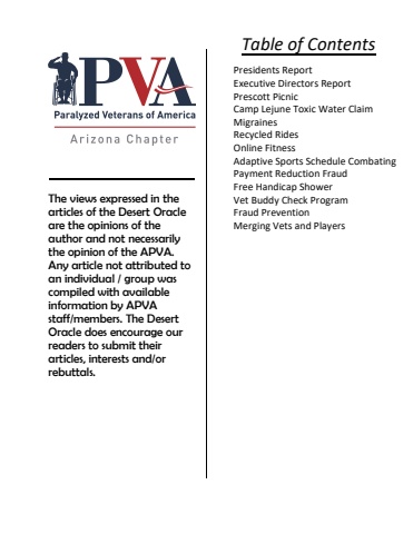 Table of ContentsThe views expressed in the articles of the Desert Oracle are the opinions of theauthor and not necessarily the opinion of the APVA. Any article not attributed toan individual / group wascompiled with available information by APVA staff/members. TheDesert Oracle does encourage ourreaders to submit theirarticles,interests and/orrebuttals. Presidents ReportExecutive Directors ReportPrescott PicnicCamp Lejune Toxic Water ClaimMigrainesRecycled RidesOnline FitnessAdaptive Sports ScheduleCombating Payment Reduction FraudFree Handicap ShowerVet Buddy Check ProgramFraud PreventionMerging Vets and Players