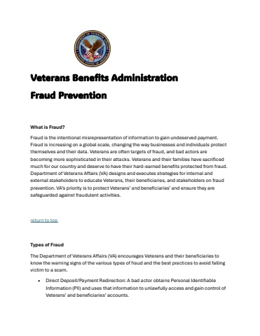 Veterans Benefits AdministrationFraud Prevention What is Fraud?Fraud is the intentional misrepresentation of information to gain undeserved payment. Fraud is increasing on a global scale, changing the way businesses and individuals protect themselves and their data. Veterans are often targets of fraud, and bad actors are becoming more sophisticated in their attacks. Veterans and their families have sacrificed much for our country and deserve to have their hard-earned benefits protected from fraud. Department of Veterans Affairs (VA) designs and executes strategies for internal and external stakeholders to educate Veterans, their beneficiaries, and stakeholders on fraud prevention.VA%u2019s priority is to protect Veterans%u2019 and beneficiaries%u2019 and ensure they are safeguarded against fraudulent activities.return to topTypes of FraudThe Department of Veterans Affairs (VA) encourages Veterans and their beneficiaries to know the warning signs of the various types of fraud and the best practices to avoid falling victim to a scam.%u2022Direct Deposit/Payment Redirection: A bad actor obtains Personal Identifiable Information (PII) and uses that information to unlawfully access and gain control of Veterans%u2019 and beneficiaries%u2019 accounts.