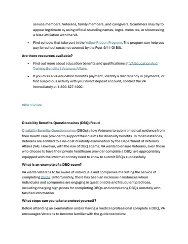 service members, Veterans, family members, and caregivers. Scammers may try to appear legitimate by using official sounding names, logos, websites, or showcasing a false affiliation with the VA.%u2022Find schools that take part in theYellow Ribbon Program. The program can help you pay for school costs not covered by the Post-9/11 GI Bill.Are there resources available?%u2022Find out more about education benefits and qualifications atVA Education And Training Benefits | Veterans Affairs.%u2022If you miss a VA education benefits payment, identify a discrepancy in payments, or find suspicious activity with your direct deposit account, contact the VA immediately at 1-800-827-1000.return to topDisability Benefits Questionnaires (DBQ) FraudDisability Benefits Questionnaires(DBQs) allow Veterans to submit medical evidence from their health care provider to support their claims for disability benefits.In most instances, Veterans are entitled to a no-cost disability examination by the Department of Veterans Affairs (VA). However, with the rise of DBQ scams, VA wants to ensure Veterans, even those who choose to have their private healthcare provider complete a DBQ, are appropriately equipped with the information they need to know to submit DBQs successfully.What is an example of a DBQ scam?VA wants Veterans to be aware of individuals and companies marketing the service of completingDBQs. Unfortunately, there has been an increase in instances where individuals and companies are engaging in questionable and fraudulent practices, including charging high prices for completing DBQs and completing DBQs remotely with falsified information.What steps can you take to protect yourself?Before attending an examination and/or having a medical professional complete a DBQ, VA encourages Veterans to become familiar with the guidance belo