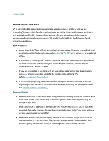 return to topProtect Yourself from FraudVA is committed to raising public awareness about predatory entities, and we are educating Veterans, their families, and partners about the dishonest behavior, activities and strategies utilized by these entities. As one of many steps towards increasing awareness about predatory companies, VA would like to highlight the following fraud prevention guidance.Best Practices%u2022Apply directly to VA or with an accredited representative. Veterans may submit their application(s) for VA benefits securelyonlineviaVA.GOVor in person at any regional office.%u2022If a Veteran is missing a VA benefits payment, identifies a discrepancy in payments, or finds suspicious activity with your direct deposit account, contact the VA immediately at 1-800-827-1000.%u2022If you are interested in working with an accredited Veteran Service Organization, agent, or attorney, you can validate their credentials utilizing VA%u2019s OGCAccreditation Search Tool.%u2022If an entity is projecting misinformation or has questionable business practices regarding VA entitlements, Veterans/Veteran Advocates may file a complaint with theFederal Trade Commission.Do's and Don%u2019ts%u2022Do be cautious of companies advertising Veterans can only obtain VA benefits with their help. These companies may not be recognized by VA and may be trying to charge illegal fees.%u2022Do be cautious of aggressive companies who may try to pressure you to sign their contract. Typically, they see frequent communications or insist %u201cyou must act now or lose your chance for benefits.%u201d%u2022Do review all documents thoroughly. Veterans should never sing a blank form for someone else to complete later. They should always review the completed form before signing and retain a comp of the completed form for their records.