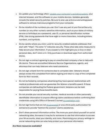 %u2022Do update your technology often:Update your computer%u2019s operating system, your internet browser, and the software on your mobile devices. Updates generally include the latest security patches. Be sure to also use antivirus and antispyware software to remove malicious programs from your computer.%u2022Do be mindful of the numbers you use: Don%u2019t use any part of your Social Security number (or any other numeric sensitive information, such as your dates of military service or birthdays) as a password, user ID, or personal identification number (PIN). Use strong passwords that have eight or more characters, including letters, numbers, and symbols.%u2022Do be careful where you click: Look for security-enabled website addresses that start with %u201chttps%u201d. The extra %u201cs%u201d indicates security. These sites take extra measures to help secure your information. If you suspect a link might give you a virus or steal personal data, don%u2019t click on it. Only purchase or download apps from authorized stores.%u2022Do not sign a contract agreeing to pay an unauthorized company a fee to help with VA claims. There are accredited Veterans Service Organizations, agents, and attorneys that can help Veterans who need assistance.%u2022Do not sign a blank form for someone else to complete later. Veterans should always review the completed from before signing and retain a copy of the completed form for their records.%u2022Do not be fooled by companies advertising they have special relationships with medical professionals and can guarantee the Veteran a benefits award. If these companies are defrauding the Federal government, Veterans can be held responsible for paying thosebenefits back.%u2022Do not provide your social security number, medical records or other personally identifiable information to anyone offering claims assistance before confirming their credentials using VA%u2019s Office of General CounselAccreditation tool.%u2022Do not sign forms that are notVA generatedor are a thirdparty authorization for someone to provide %u201cbehind-the-scenes%u201d claims assistance.%u2022Don%u2019t share personal information online: The more you post about yourself on social networking sites, the easier it may be for someone to use that information to access your VA accounts, steal your identity, and more. Maximizing your privacy settings on social networking sites can also help protect your personal information.Are there resources available?
