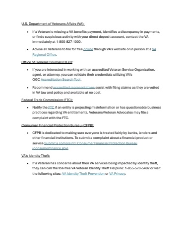 U.S. Department of Veterans Affairs (VA):%u2022If a Veteran is missing a VA benefits payment, identifies a discrepancy in payments, or finds suspicious activity with your direct deposit account, contact the VA immediately at 1-800-827-1000.%u2022Advise all Veterans to file for freeonlinethrough VA%u2019s website or in person at aVA Regional Office.Office of General Counsel (OGC):%u2022If you are interested in working with an accredited Veteran Service Organization, agent, or attorney, you can validate their credentials utilizing VA%u2019s OGCAccreditation Search Tool.%u2022Recommendaccredited representativesassist with filing claims as they are vetted in VA law and policy and available at no cost.Federal Trade Commission (FTC):%u2022Notify theFTCif an entity is projecting misinformation or has questionable business practices regarding VA entitlements, Veterans/Veteran Advocates may file a complaint with the FTC.Consumer Financial Protection Bureau (CFPB):%u2022CFPB is dedicated to making sure everyone is treated fairly by banks, lenders and other financial institutions. To submit a complaint about a financial product or serviceSubmit a complaint | Consumer Financial Protection Bureau (consumerfinance.gov)VA%u2019s Identity Theft:%u2022If a Veteran has concerns about their VA services being impacted by identity theft, they can call the toll-free VA Veteran Identity Theft Helpline: 1-855-578-5492 or visit the following sites:VA Identity Theft PreventionorVA Privacy.