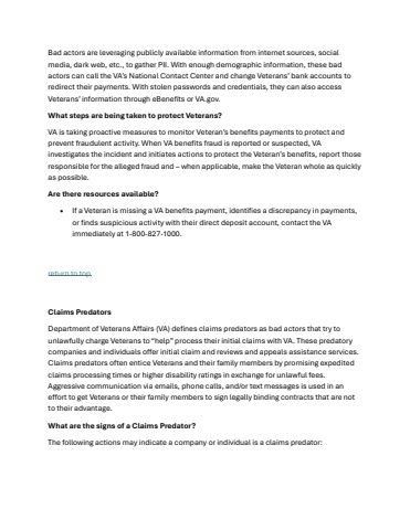 Bad actors are leveraging publicly available information from internet sources, social media, dark web, etc., to gather PII. With enough demographic information, these bad actors can call the VA%u2019s National Contact Center and change Veterans%u2019 bank accounts to redirect their payments. With stolen passwords and credentials, they can also access Veterans%u2019 information through eBenefits or VA.gov.What steps are being taken to protect Veterans?VA is taking proactive measures to monitor Veteran%u2019s benefits payments to protect and prevent fraudulent activity. When VA benefits fraud is reported or suspected, VA investigates the incident and initiates actions to protect the Veteran%u2019s benefits, reportthose responsible for the alleged fraud and %u2013when applicable, make the Veteran whole as quickly as possible.Are there resources available?%u2022If a Veteran is missing a VA benefits payment, identifies a discrepancy in payments, or finds suspicious activity with their direct deposit account, contact the VA immediately at 1-800-827-1000.return to topClaims PredatorsDepartment of Veterans Affairs (VA) defines claims predators as bad actors that try to unlawfully charge Veterans to %u201chelp%u201d process their initial claims with VA. These predatory companies and individuals offer initial claim and reviews and appeals assistance services. Claims predators often entice Veterans and their family members by promising expedited claims processing times or higher disability ratings in exchange for unlawful fees. Aggressive communication via emails, phone calls, and/or text messages is used in an effort to get Veterans or their family members to sign legally binding contracts that are not to their advantage.What are the signs of a Claims Predator?The following actions may indicate a company or individual is a claims predator: