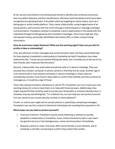 At VA, we are committed to monitoring fraud trends to identify new schemes and tactics that may affect Veterans and their beneficiaries. Romance and friendship scams have been recognized as a growing threat.A fraudster starts by targeting an online space, such as a dating app or social media platform. They create a fake profile, using images/name of an actual person, and connect with the victim through a friend request or message and begin communication. Fraudsters attempt to establish a quick relationship or friendship with the individual through friendly gestures and consistent messages. Once trust is gained, they will request money, personally identifiable information (PII), or other compromising information.How do scammers target Veterans? What are the warning signs? How can you tell if a profile is fake or misleading?First, pay attention to their messages and communication style. Are they overly flattering? Do they attempt to establish a relationship or friendship too fast? Fraudsters may make statements like, %u201cI know we just started talking last week, but I consider you to be one of my best friends, and I hope you feel the same.%u201dSecond, a fake profile may avoid video and phone calls or in-person meetings. They use excuses like a broken computer or phone camera or that they live far away. Another sign is if an online friend or love interest schedules in-person meetings or video calls but consistently cancels. If you haven%u2019t been able to confirm their identity, but they continue to message you, it could be a sign of fraud.Third, they request monetary assistance or ask for PII. Fraudsters can try to coerce you into sending money for a trip to meet them or to help with financial woes. Additionally, they might request PII that could be used to access your VA benefits or conduct identity fraud. A fraudster may say something like, \Can you send me your social security number or home address?\Fourth, an online user might ask for private photos or potentially comprising messages. Fraudsters can use this content to blackmail individuals into sending them payment or PII.What steps can you take to protect yourself?%u2022Trust your instincts.Fraudsters may be overly flattering or attempt to quickly establish a relationship or friendship. If your online interactions with a user seem too good to be true or feel disingenuous, cease communication immediately.%u2022Request a phone or video chat early. With online friends or love interests, ask to schedule a call after connecting to confirm they match their profile.