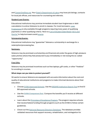 andCareerOneStop.org. YourState%u2019s Department of Labormay have job listings, contacts for local job offices, and resources for counseling and referrals.Student Loan Scams:Educational institutions may promise immediate student loan forgiveness or debt cancellation to entice Veterans to enroll in classes. For most borrowers,Loan Forgivenessis only available through programs requiring many years of qualifying payments or other qualifying criteria. Here is aList of Student Debt Relief %u201cDo%u2019s and Don%u2019ts%u201dto help borrowers avoidscams.Scholarship Scams:Educational institutions may %u201cguarantee%u201d Veterans a scholarship in exchange for a redemption/processing fee.Seminars:Veterans may be promised a scholarship and financial aid under the guise of high-pressure sales pitches where they feel pressured to pay immediately or risk losing the so-called %u201copportunity.%u201dFree Gifts:Veterans may be promised incentives such as free laptops, gift cards, or other %u201cfreebies%u201d for enrolling in courses.What steps can you take to protect yourself?VA wants to ensure Veterans are equipped with accurate information about the cost and quality of educational institutions and programs to make informed decisions about their education.%u2022ChooseGI Bill Approved Schools. Use theWEAMS Institution SearchToolto find GI Bill approved schools.%u2022Use theGI Bill Comparison Tool. Compare the benefits you%u2019ll receive at different schools.%u2022Learn about thePrinciples of Excellence Program. The program requires schools that receive federal funding through programs such as the GI Bill to follow certain guidelines.%u2022Check out theNational Resource Directory Database. The database provides validated resources that support recovery, rehabilitation, and reintegration for