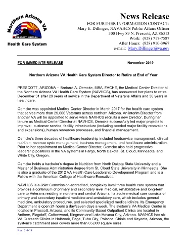 PRESCOTT, ARIZONA -- Barbara A. Oemcke, MBA, FACHE, the Medical Center Director at