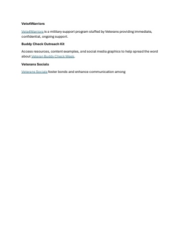 Vets4WarriorsVets4Warriorsis a military support program staffed by Veterans providing immediate, confidential, ongoing support.Buddy Check Outreach KitAccess resources, content examples, and social media graphics to help spread the word aboutVeteran Buddy Check Week.Veterans SocialsVeterans Socialsfoster bonds and enhance communication among