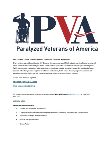 Join Our PVA Online Fitness Classes: Fitness for Everyone, Anywhere!Short on time but still want to stay fit? Discover the convenience of PVA%u2019s adaptive online fitness programs! Work out from the comfort of your home and maximize your time and effort to achieve your fitness goals. PVA%u2019s experienced instructors tailor exercises to meet your needs, ensuring you get the most out of every session. Whether you%u2019re a beginner or a fitness enthusiast, PVA%u2019s online fitness program welcomes all experience levels. Check out our class schedule and join us on your fitness journey.Please click below to register.REGISTER FOR LIVE CLASSESTAKE A CLASS ON DEMANDFor more information about online programs, contactVickie Lincksatvickiel@pva.orgor call (202) 416-7654.VICKIE LINCKSBenefits of Online Fitness:%u2022Enhanced Cardiovascular Health%u2022Cognitive Improvements (including better reflexes, memory, and hand-eyecoordination)%u2022Increased Strength and Endurance%u2022Greater Range of Motion%u2022Stress Relief