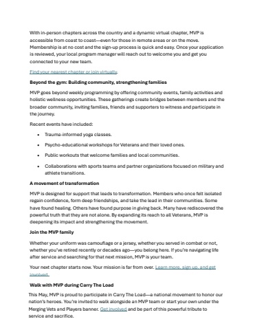 With in-person chapters across the country and a dynamic virtual chapter, MVP is accessible from coast to coast%u2014even for those in remote areas or on the move. Membership is at no cost and the sign-up process is quick and easy. Once your application is reviewed, your local program manager will reach out to welcome you and get you connected to your new team.Find your nearest chapter or join virtually.Beyond the gym: Building community, strengthening familiesMVP goes beyond weekly programming by offering community events, family activities and holistic wellness opportunities. These gatherings create bridges between members and the broader community, inviting families, friends and supporters to witness and participate in the journey.Recent events have included:%u2022Trauma-informed yoga classes.%u2022Psycho-educational workshops for Veterans and their loved ones.%u2022Public workouts that welcome families and local communities.%u2022Collaborations with sports teams and partner organizations focused on military andathlete transitions.A movement of transformationMVP is designed for support that leads to transformation. Members who once felt isolated regain confidence, form deep friendships, and take the lead in their communities. Some have found healing. Others have found purpose in giving back. Many have rediscovered the powerful truth that they are not alone. By expanding its reach to all Veterans, MVP is deepening its impact and strengthening the movement.Join the MVP familyWhether your uniform was camouflage or a jersey, whether you served in combat or not, whether you%u2019ve retired recently or decades ago%u2014you belong here. If you%u2019re navigating life after service and searching for that next mission, MVP is your team.Your next chapter starts now. Your mission is far from over.Learn more, sign up, and get involved.Walk with MVP during Carry The LoadThis May, MVP is proud to participate in Carry The Load%u2014a national movement to honor our nation%u2019s heroes. You%u2019re invited to walk alongside an MVP team or start your own under theMerging Vets and Players banner.Get involvedand be part of this powerful tribute toservice and sacrifice.