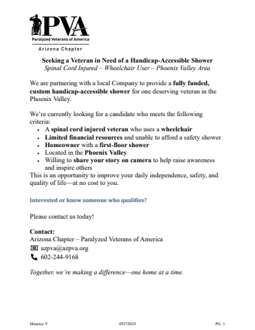 Maurice V05272025PG 1Seeking a Veteran in Need of a Handicap-Accessible ShowerSpinal Cord Injured Wheelchair User Phoenix Valley AreaWe are partnering with a local Companyto provide a fully funded, custom handicap-accessible showerfor one deserving veteran in the Phoenix Valley.We%u2019re currently looking for a candidate who meets the following criteria:%u2022A spinal cord injured veteranwho uses a wheelchair%u2022Limited financial resourcesand unable to afford a safety shower%u2022Homeownerwith a first-floor shower%u2022Located in the Phoenix Valley%u2022Willing to share your story on camerato help raise awareness and inspire othersThis is an opportunity to improve your daily independence, safety, and quality of life%u2014at no cost to you.Interested or know someone who qualifies?Please contact us today!Contact:Arizona Chapter Paralyzed Veterans of America%ud83d%udce7azpva@azpva.org%ud83d%udcde602-244-9168Together, we%u2019re making a difference%u2014one home at a time.
