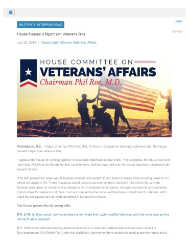 “I applaud the House for coming together to pass nine bipartisan veterans bills. This Congress, the House has sent
