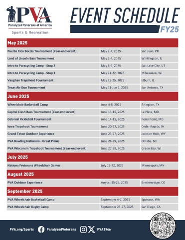 May2025PuertoRicoBocciaTournament(Year-endevent)May24,2025SanJuan,PRLandofLincolnBassTournamentMay24,2025Whittington,ILIntrotoParacyclingCamp-Stop2May89,2025SaltLakeCity,UTIntrotoParacyclingCamp-Stop3May2122,2025Milwaukee,WIVaughanTrapshootTournamentMay23-25,2025Elburn,ILTexasAirGunTournamentMay31-Jun1,2025SanAntonio,TXJune2025WheelchairBasketballCampJune4-8,2025Arington,TXCapitalClashBassTournament(Year-endevent)June13-15,2025LaPata,MDColonialPickleballTournamentJune14-15,2025PerryPoint,MDIowaTrapshootTournamentJune20-22,2025CedarRapids,IAGrandTetonOutdoorExperienceJune23-27,2025JacksonHole,WPVABowlingNationals-GreatPlainsJune26-29,2025Omaha,NEPVAWisconsinTrapshootTournament(Year-endJune27-29,2025GreenBay,WIJuly2025NationalVeteransWheelchairGamesJuly17-22,2025Minneapolis,MNAugust2025PVAOutdoorExperienceAugust25-29,2025Breckenridge,COSeptember2025PVAWheelchairBasketballCampSeptember47,202Spokane,WAPVAWheelchairRugbyCampSeptember2527,20SanDiego,CAFY25EVENTSCHEDULE