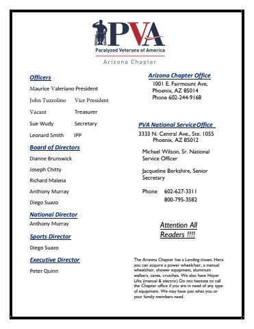 Arizona Chapter Office1001 E. Fairmount Ave, Phoenix,AZ 85014Phone602-244-9168 PVA National ServiceOffice3333 N. Central Ave., Ste. 1055 Phoenix, AZ 85012Michael Wilson, Sr. National Service OfficerJacqueline Berkshire, Senior Secretary Phone 602-627-3311800-795-3582Attention All Readers !!!!The Arizona Chapter has a Lendingcloset. Here you can acquirea power wheelchair,a manualwheelchair, shower equipment, aluminumwalkers, canes, crutches. We also have HoyerLifts (manual & electric) Do not hesitate to call the Chapter office if you are in need of any type of equipment. We may have just what you or your family members need.OfficersMaurice Valeriano PresidentJohn Tuzzolino Vice PresidentVacant TreasurerSue WudySecretary Leonard SmithIPP BoardofDirectorsDianne Brunswick Joseph ChittyRichard MalenaAnthony MurrayDiego SuazoNational DirectorAnthony MurraySportsDirectorDiego Suazo Executive DirectorPeter Quinn