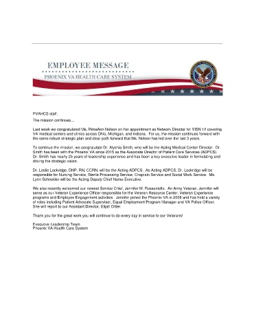 To continue the mission, we congratulate Dr. Alyshia Smith, who will be the Acting Medical Center Director. Dr.