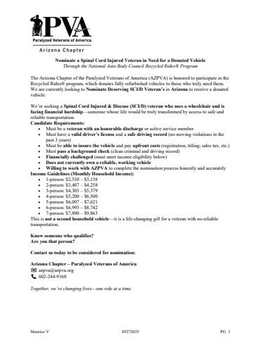 Maurice V05272025PG 1Nominate a Spinal Cord Injured Veteran in Need for a Donated VehicleThrough the National Auto Body Council Recycled Rides%u00ae ProgramThe Arizona Chapter of the Paralyzed Veterans of America (AZPVA) is honored to participate in the Recycled Rides%u00ae program, which donates fully refurbished vehicles to those who truly need them. We are currently looking to Nominate Deserving SCI/D Veteran%u2019sin Arizonato receive a donated vehicle.We%u2019re seeking a Spinal Cord Injured& Disease(SCI/D) veteran who uses a wheelchair and is facing financial hardshipsomeone whose life would be truly transformed by access to safe and reliable transportation.Candidate Requirements:%u2022Must be a veteran with an honorable dischargeor active service member%u2022Must have a valid driver%u2019s licenseand a safe driving record(no moving violations in the past 3 years)%u2022Must be able to insure the vehicleand pay upfront costs(registration, titling, sales tax, etc.)%u2022Must pass a background check(clean criminal and driving record)%u2022Financially challenged(must meet income eligibility below)%u2022Does not currently own a reliable, working vehicle%u2022Willing to work with AZPVAto complete the nomination process honestly and accuratelyIncome Guidelines (Monthly Household Income):%u20221-person: $2,510 %u2013$3,138%u20222-person: $3,407 %u2013$4,258%u20223-person: $4,303 $5,379%u20224-person: $5,200 $6,500%u20225-person: $6,097 %u2013$7,621%u20226-person: $6,993 %u2013$8,742%u20227-person: $7,890 %u2013$9,863This is not a second household vehicleit is a life-changing gift for a veteran with no reliable transportation.Know someone who qualifies?Are you that person?Contact us today to be considered for nomination:Arizona Chapter Paralyzed Veterans of America%ud83d%udce7azpva@azpva.org%ud83d%udcde602-244-9168Together, we%u2019re changing livesone ride at a time.