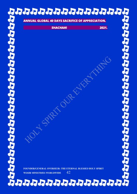 ANNUAL GLOBAL 40 DAYS SACRIFICE OF APPRECIATION. SHACHAH! 2021. FOUNDER/GENERAL OVERSEER: THE ETERNAL BLESSED HOLY SPIRIT WOSIB MINISTRIES WORLDWIDE 42