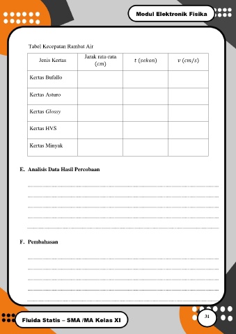 Tabel Kecepatan Rambat Air Jarak rata-rata Jenis Kertas ( ) ( / ) ( ) Kertas Bufallo Kertas Asturo Kertas Glossy Kertas HVS Kertas Minyak E. Analisis Data Hasil Percobaan F. Pembahasan 31