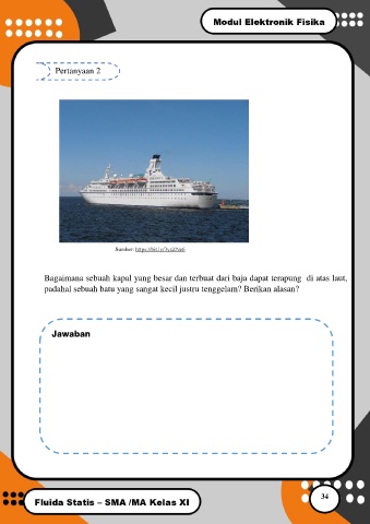 Pertanyaan 2 Sumber: https://bit.ly/3yzZNe6 Bagaimana sebuah kapal yang besar dan terbuat dari baja dapat terapung di atas laut, padahal sebuah batu yang sangat kecil justru tenggelam? Berikan alasan? Jawaban 34